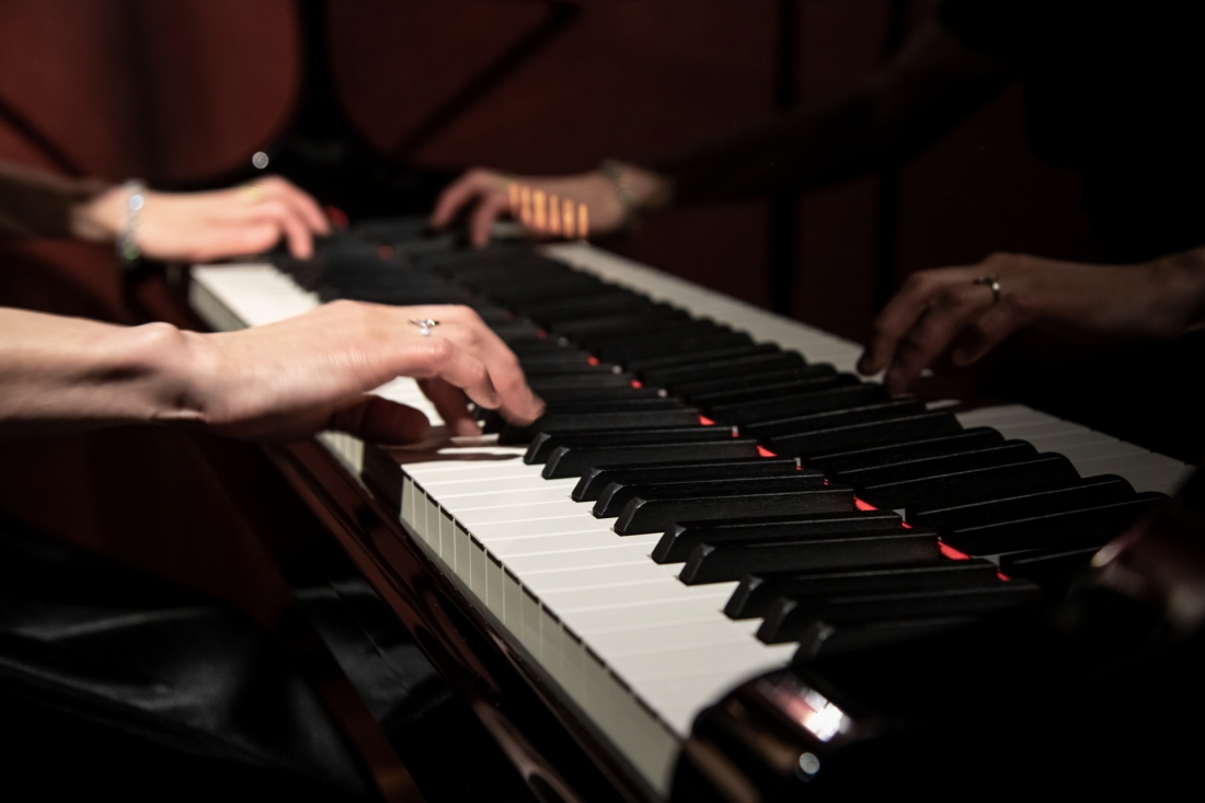 店内からは、ステージ上に並ぶ三種類のピアノの横に、絶えずそれらが8つの宝石のように煌めきます。